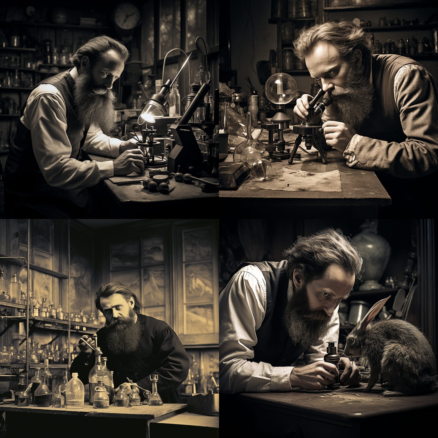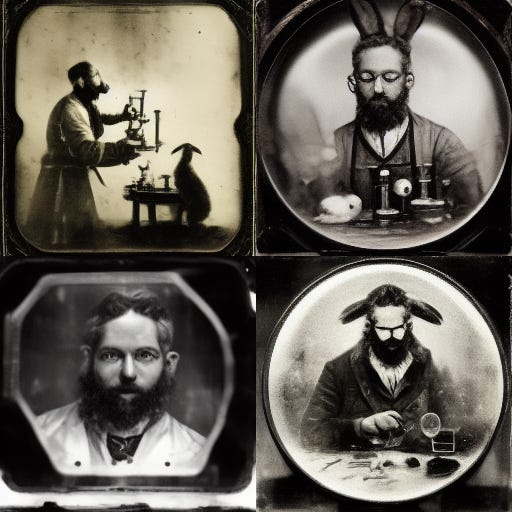One of the text prompts I wanted to turn into an image was “a bearded 19th-century scientist in a laboratory examining a rabbit's eye, black and white photography, wet plate collodion.” I wanted this image to look like it was a photograph from the 1870s. As the leading technique of producing photographic negatives on glass from 1850 onwards, I wanted the image to carry the characteristics of a wet plate collodion. As a result of my prompt, I received the following variations from Midjourney.